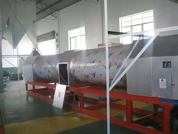 我們解決其技術(shù)問(wèn)題所采用的技術(shù)方案是:一種新型環(huán)保節(jié)能熱風(fēng)炒爐,由電源供電,包括第一燃燒室、第二燃燒室、熱風(fēng)炒爐滾筒、存料機(jī)、自動(dòng)喂料器、出料機(jī)、引風(fēng)機(jī)和排潮風(fēng)機(jī),所述熱風(fēng)炒爐滾筒的入口端通過(guò)自動(dòng)喂料器與所述存料斗連通,所述熱風(fēng)炒爐滾筒的入口端還通過(guò)風(fēng)道與所述排潮風(fēng)機(jī)連通,所述熱風(fēng)炒爐滾筒的出口端與出料機(jī)連通,所述第一燃燒室和第二燃燒室通過(guò)風(fēng)道與引風(fēng)機(jī)連通,所述第一燃燒室和第二燃燒室分別位于所述熱風(fēng)炒爐滾筒的下方,所述熱風(fēng)炒爐滾筒軸心線與水平面形成2°到8°的夾角,所述第一燃燒器和第二燃燒器安裝位置在相應(yīng)燃燒室的前端或者相應(yīng)燃燒室的兩個(gè)側(cè)面。我們?cè)O(shè)備取消了原熱風(fēng)炒爐所配套的單獨(dú)熱風(fēng)爐、彎段風(fēng)道或直段風(fēng)道;在炒爐滾筒下方設(shè)計(jì)安裝兩份熱風(fēng)燃燒室,用燃燒器產(chǎn)生的熱風(fēng)直接對(duì)滾筒進(jìn)行加熱,******限度地縮減了炒爐散熱環(huán)節(jié)和面積,從而實(shí)現(xiàn)炒爐連段式加熱。與現(xiàn)有設(shè)備相比,我們公司設(shè)備充分利用了熱風(fēng)釋放的熱量,減少了熱量損失,單噸油料或糧食加工消耗添人氣甚至能降低到25nm3,降低了17%,節(jié)能降耗效果非常明顯,得到了客戶的一致好評(píng)。與現(xiàn)有設(shè)備相比,同等日加工量,所配兩臺(tái)燃燒器合計(jì)功率比現(xiàn)有設(shè)備燃燒器功率下降20%-30%,熱風(fēng)設(shè)定溫度有750-800℃下降到400-500℃,明顯延長(zhǎng)了炒爐的使用壽命。第一燃燒室和第二燃燒室的功能各不相同,工作溫度也不一致,第一燃燒室和第二燃燒室能夠?qū)崿F(xiàn)分段加熱溫度控制,更加靈活與合理,安全可靠,便于操作與控制。